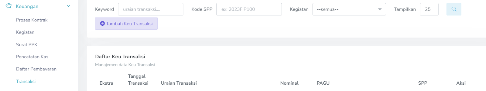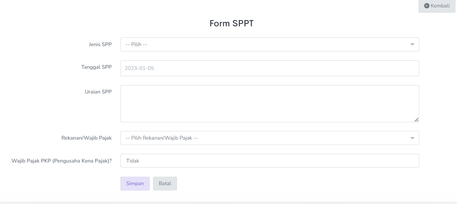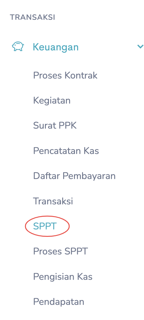 Jika sudah mengisi menu transaksi langkah selanjutnya adalah pembuatan SPP UP. Pembuatan SPP UP ada di Menu Transaksi → Keuangan → SPPT → Tambah SPPT. Tampilan menu seperti di bawah ini