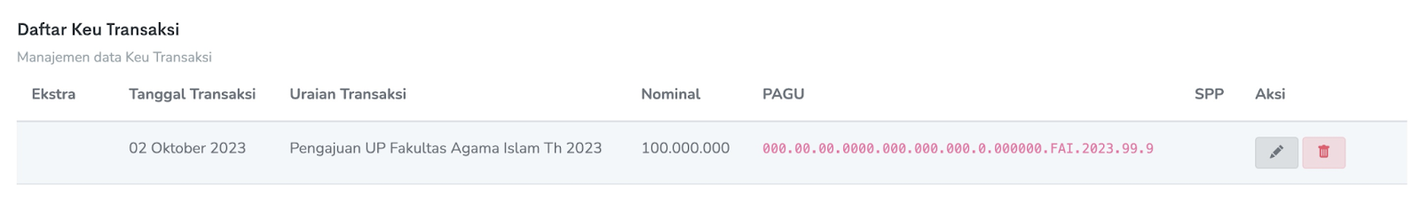 Setelah klik simpan SPP Uang Persediaan sudah dibuat langkah selanjutnya adalah memasukan Transaksi yang telah dibuat tahap sebelumnya ke SPP Uang Persediaan yang telah dibuat dengan memilih SPP Uang Persediaan → Ekstra → Aksi → Transaksi → Tambah Transaksi → Pilih Transaksi → Centang → Simpan.