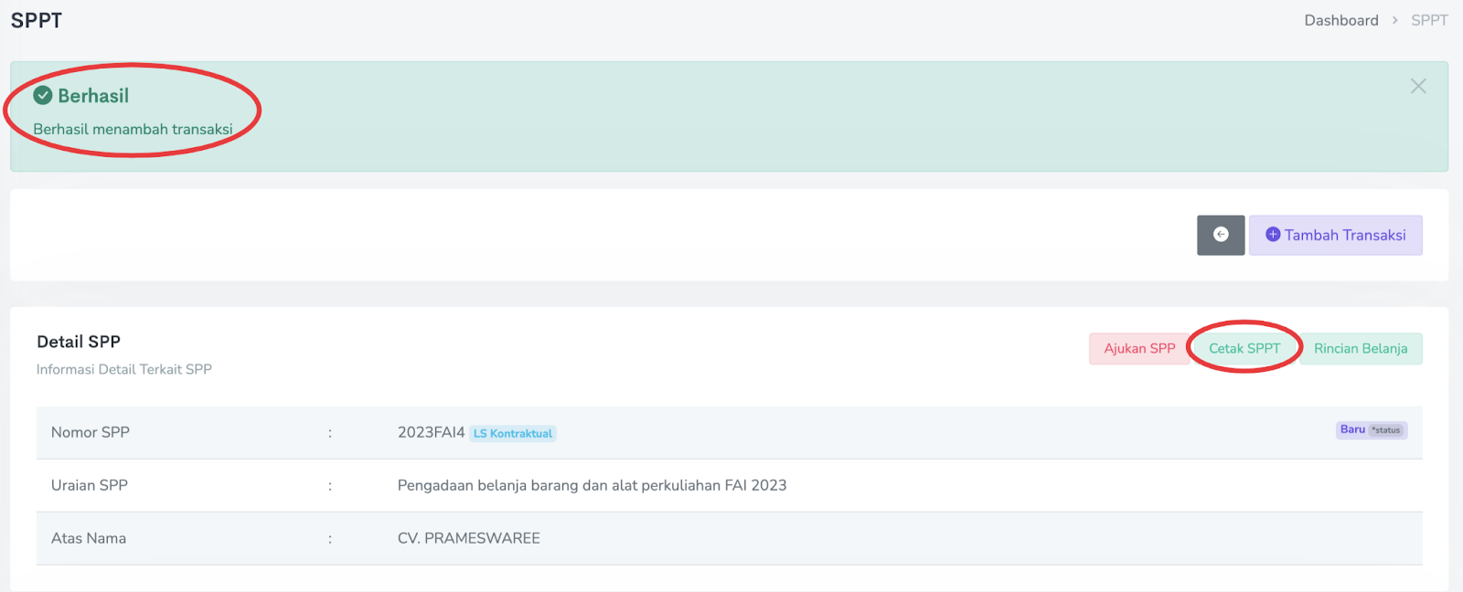 Setelah memasukan transaksi ke dalam SPP Uang Persediaan, langkah pembuatan SPP telah selesai dan proses selanjutnya adalah mencetak SPP dan Surat Pertanggungjawaban Belanja. Menu cetak ada di Ekstra → Aksi → Transaksi → Cetak SPPT dan Cetak Rincian Belanja.
