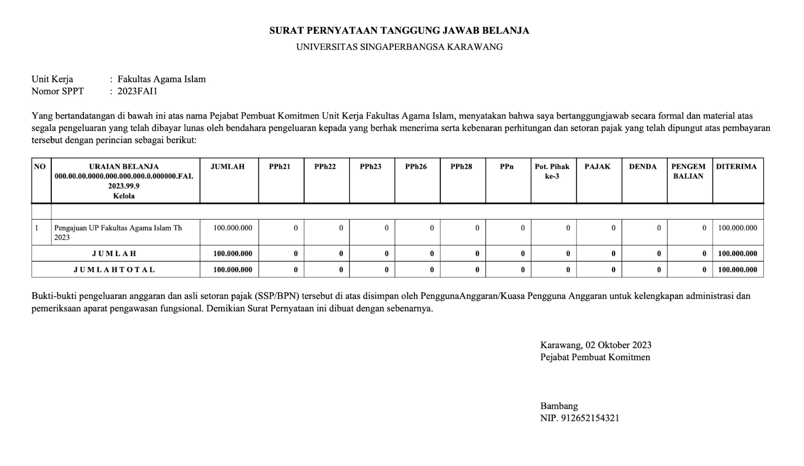 Berikut tampilan Cetak Surat Pernyataan Tanggungjawab Belanja