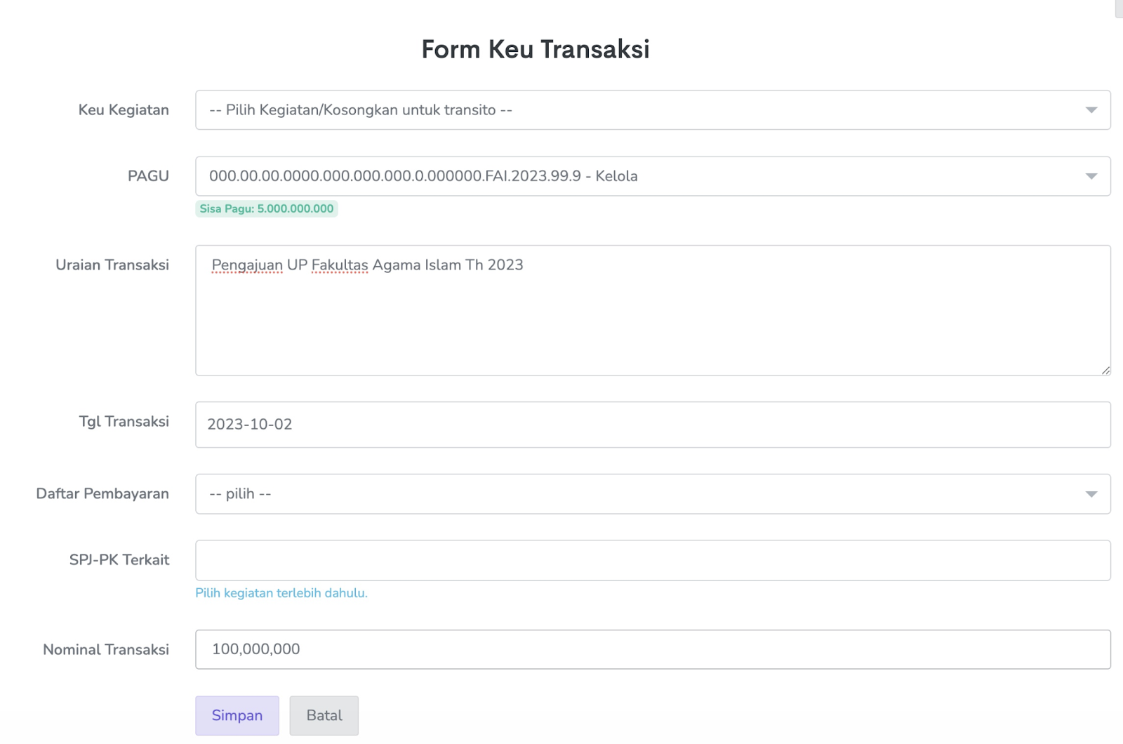 Setelah masuk ke Menu Transaksi → Tambah Transaksi → Isi Data sesuai dengan yang dibutuhkan. Tampilan seperti gambar di bawah ini