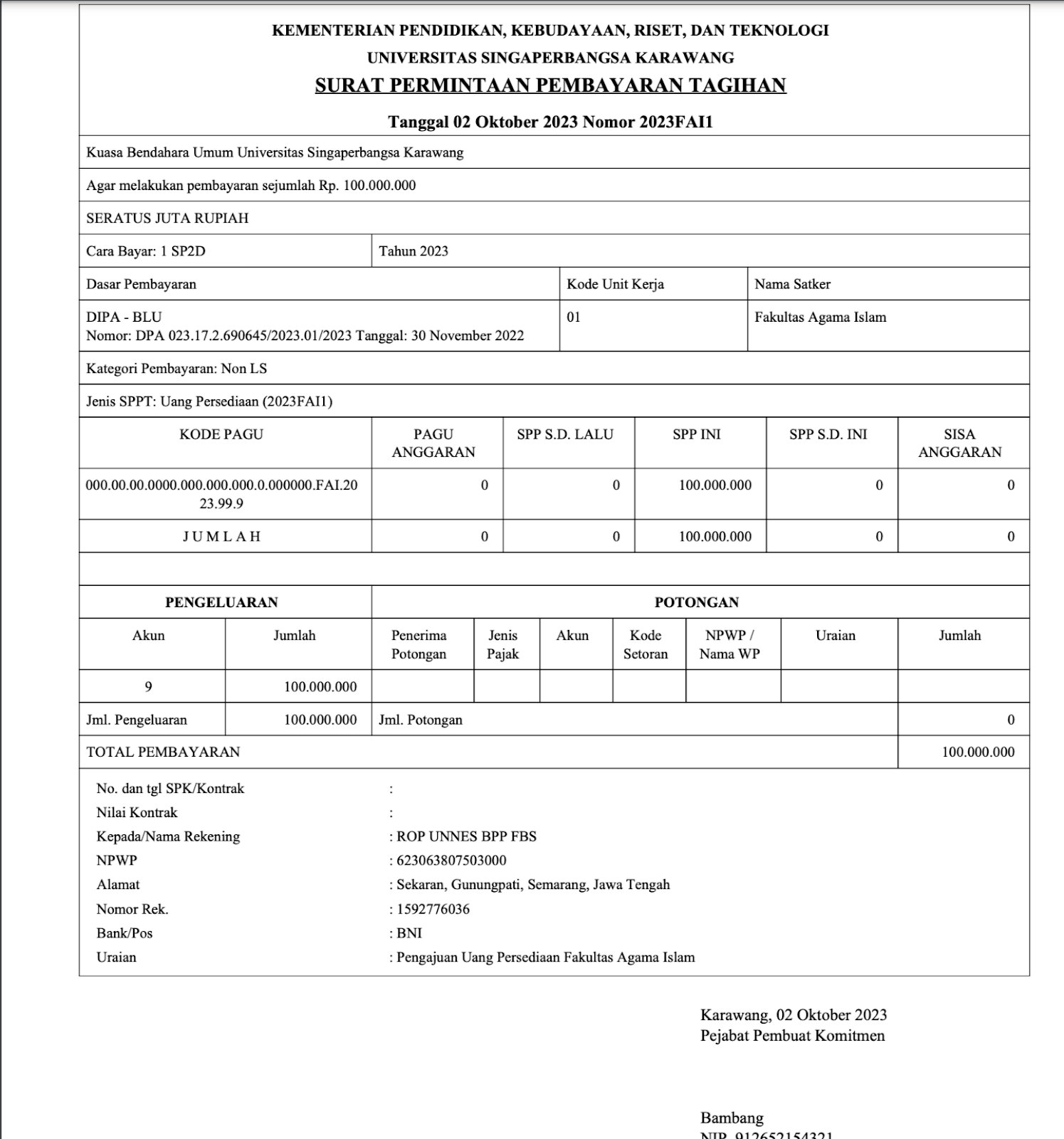 Berikut tampilan form SPP Uang Persediaan yang telah di cetak