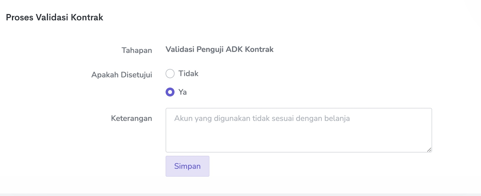 Jika semua dokumen yang telah di upload oleh unit kerja telah sesuai silahkan Validasi ADK Kontrak dan Klik “Simpan”