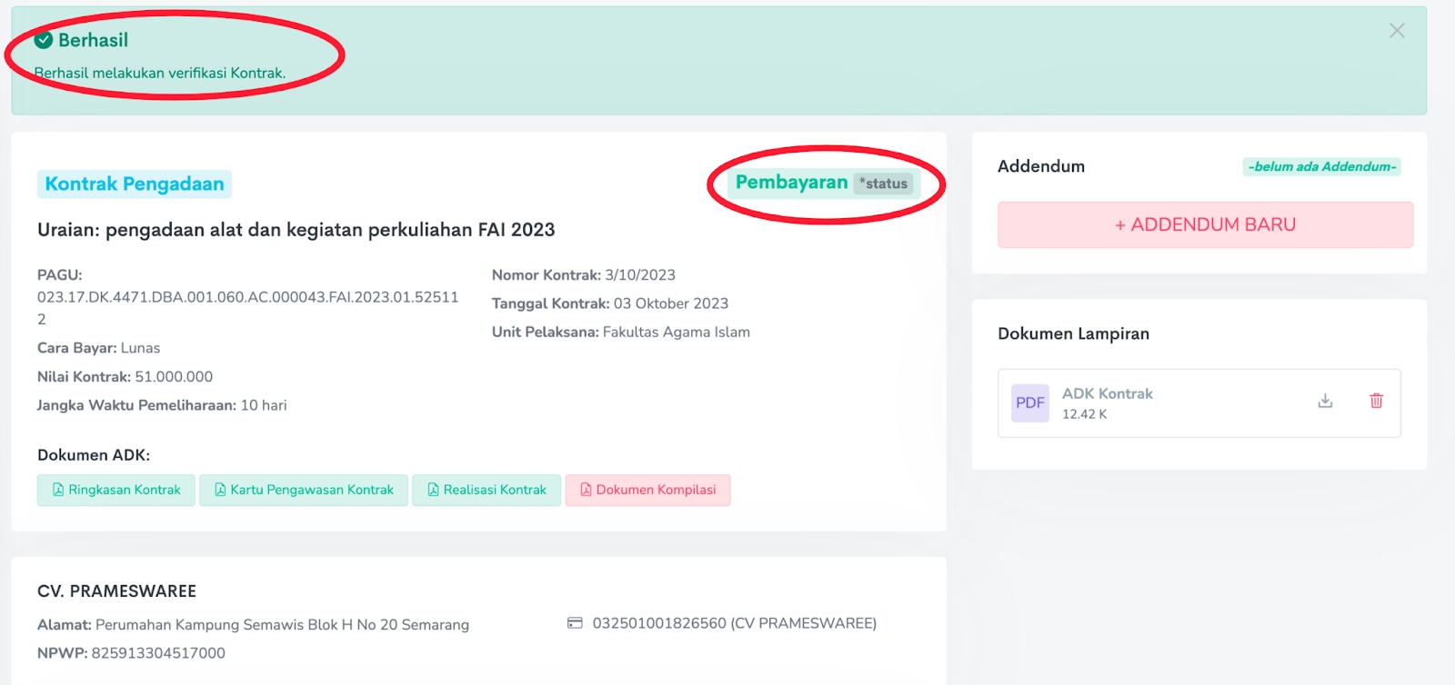 Jika status sudah berubah ke “Pembayaran” proses Validasi ADK Kontrak sudah selesai. Unit kerja bisa melanjutkan langkah pembuatan SPP LS Kontraktual