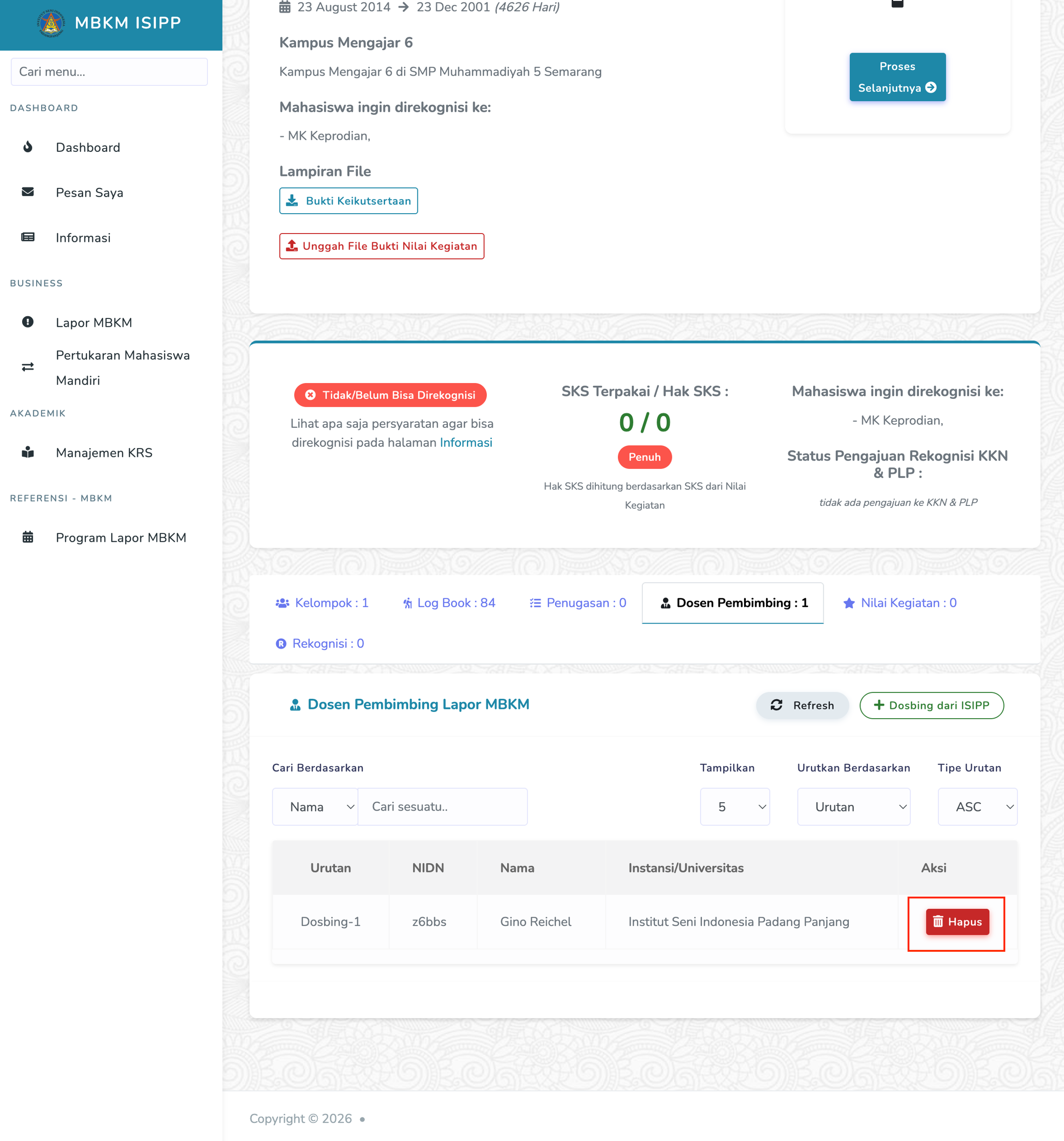 Setiap tindakan (tambah/hapus dosbing) akan tercatat dalam log sistem